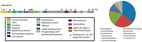 Genome annotation of the sorted single virus vSAG 92-C13. Conserved ORFs within Streptococcus phages are indicated with asterisk (*). The pie chart depicts the closest genera hits of the annotated proteins of vSAG 92-C13 (see Methods for details).