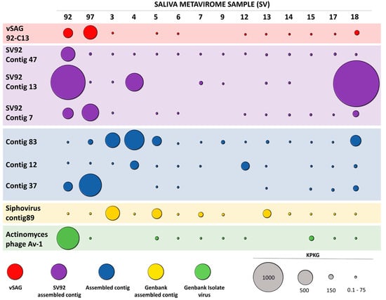 Virome metagenomic fragment recruitment was used to assess the abundance and ubiquity of publicly available viruses of the oral cavity in our viral salivary metagenomes. This viral dataset was comprised of 439 oral viruses (Table S4), including 189 publicly available isolates (mainly Streptococcus phages), our single viruses, and 234 assembled viral contigs obtained in this study and by Pride and colleagues [18]. Data showed that none of these 439 oral viruses were present in all analyzed salivary viromes (Figure 4 and Figure S5 and Table S6). Within the top ten most abundant viruses, a clearly uneven abundance was observed among samples, and no apparent predominance of the same viral species was found in the saliva samples (Figure 4 and Figures S5 and S6). For instance, the most abundant and dominant virus in the virome sample SV92 (viral contig 13) was not present in the rest of the samples, except that of the virome 4 (Figure 4). Similar results were found for the abundant vSAG 92-C13, and other salivary viruses. Viral genomes from viromics were clearly more abundant than isolates, and only the Actinomyces phage isolate Av-1 (NC_009643.1), out of 189 isolates, was significantly detected in four of the analyzed viromes, while the rest were almost absent (Figure 4).
