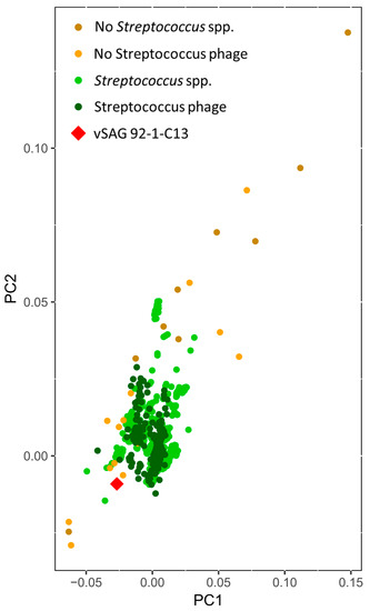 Among those vSAGs representing bona fide viruses, the vSAG 92-C13 (Figure 2) sorted out from the viral fraction gate P1 of sample SV92 (0.22 μm-filtered, Figure 1) was one of the most abundant viruses in the oral virome (ranking 14 and 2 in samples SV92 and SV97, respectively). This viral genome was fully recruited in the corresponding viral metagenome (Figure 3), and was present in four of the analyzed samples (Figure 4). Nearly 25% of the annotated proteins of that virus were assigned to prophages that infect different Streptococcus species (Figure 2), and half of them were assigned to a prophage of Streptococcus sp. strain 263 (Figure 2 and Table S5). Although tentative, according to manual genome annotation (Tables S2 and S4) and the Metavir platform, the uncultured virus 92-C13 and the rest of the bona fide viruses (vSAGs 108-D21, 108-M3, 108-G5, 92-C19, 92-D8) could belong to the order Caudovirales. Principal component analysis based on genome tetranucleotide frequencies [33] of oral bacteriophages (n = 189; Table S4) and putative bacterial hosts (n = 10,751, obtained from NCBI and GOLD databases) showed that the abundant virus vSAG 92-C13 was related to a cluster of Streptococcus-infecting phages (Figure 5), albeit not placed at the center of that group.
