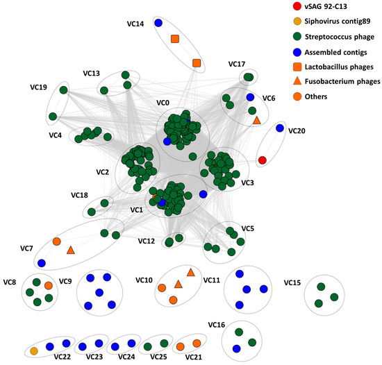 Viral gene network analyses have been recently used to address the relatedness and grouping of viruses within the context of viral taxonomy [12,33,36]. Here, we calculated a massive viral gene network with all publicly available oral viruses (n = 424), to unveil the structure of viral communities in the oral cavity (Figure 6). Data revealed that salivary viruses were structured into 26 major homogenous viral clusters, comprised of at least two viruses (see Methods) with a high number of gene-sharing connections. Each viral cluster (VC) corresponds to approximately genus-level groupings, as previously described [12,33,36] (Figure 6). In the case of uncultured viruses from the metagenomic assembly (n = 234), a total of 210 viral contigs did not have connections with any other virus, and thus each one of these viral contigs formed a singlet cluster (note that these are not depicted in Figure 6). It is important to remark that the total number of viral clusters in the analyzed samples was ≈200, albeit most of them are comprised of a single viral member. In the case of the characterized Streptococcus phage isolates (n = 183) available in the Genbank database, they were grouped in the four largest homogenous viral clusters (VCs) 0–3, or genera with a high number of gene-sharing connections. It is worth noting that among those 26 major clusters with a high number of connections, most of the viral clusters (n = 20) have a representative isolate. Finally, in good agreement with the host prediction data of vSAG 92-C13 (Figure 5), this single virus was in a discrete viral cluster (VC20), but was related to VC3, a prominent and the largest Streptococcus phage viral cluster found in the oral virome, along with VC0, VC1, and VC2.