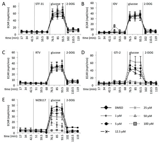 Blocking glucose uptake by CD4+ T cells requires inhibitors that target multiple GLUT proteins. The extracellular acidification rate (ECAR in mpH per min) was determined in real time for activated CD4+ T cells in the absence of glucose, followed by sequential injection of GLUT inhibitor at 0, 1, 5, 12.5, 25, 50, and 100 μM; glucose (1 g/L); and 2-deoxyglucose (4.5 g/L). (a) STF-31; (b) Indinavir (IDV); (c) Ritonavir (RTV); (d) GTI-2; (e) WZB117. The data shown are representative experiments from replicates with three to five different donors.