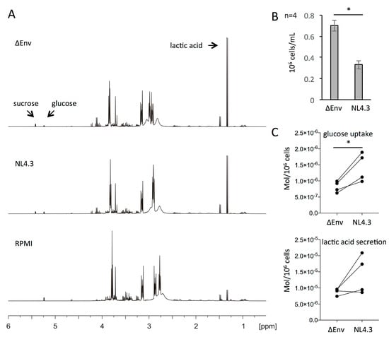 1H-NMR analysis of glucose consumption and lactic acid production of HIV-1 infected and uninfected CD4+ T cells. (a) Representative 1H-NMR spectra of the supernatant of CD4+ T cell cultures infected with HIV-1 NL4.3 or a non-infectious control (ΔEnv), as well as RPMI media without cells. Arrows indicate peaks corresponding to sucrose, glucose, and lactic acid; (b) The numbers of CD4+ T cells present in the cultures (ΔEnv or wt NL4.3) used for NMR analysis after 24 h; (c) Cell number-corrected glucose uptake and lactic acid production after 24 h of culturing CD4+ T cells infected with HIV-1 NL4.3 or the non-infectious ΔEnv control. Significance is indicated by * p ≤ 0.05.