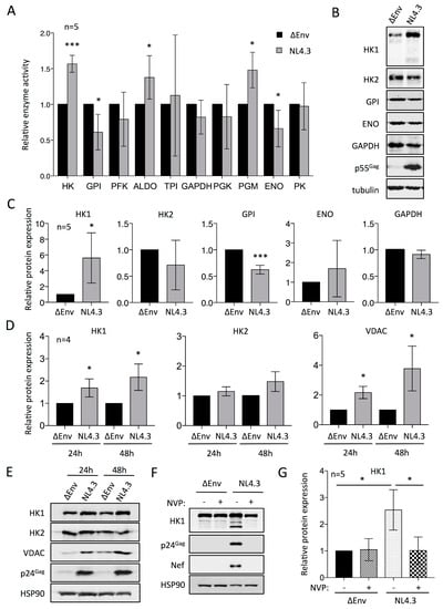 Relative enzymatic activity and expression levels of glycolytic factors in uninfected and HIV-1 infected CD4+ T cells. (a) Relative activity of glycolytic enzymes in lysates from uninfected (∆Env) and HIV-1 infected (NL4.3) cells after 48 h of infection: hexokinase (HK), glucose-6-phosphate isomerase (GPI), phosphofructokinase (PFK), aldolase (ALDO), triose phosphate isomerase (TPI), glyceraldehyde-3-phosphate dehydrogenase (GAPDH), phosphoglycerate kinase (PGK), phosphoglycerate mutase (PGM), enolase (ENO), and pyruvate kinase (PK); (b) Representative Western blotting analysis of expression of glycolytic enzymes in cell lysates from (a); (c) Relative abundances of glycolytic enzymes from the Western blotting analysis shown in (b) from five donors. Protein abundances were quantified relative to tubulin expression and values normalized to the amounts present in cells treated with ΔEnv NL4.3; (d) Time course analysis of changes in protein expression of HK1, HK2, and VDAC at 24 and 48 h following infection with HIV-1 wt or ΔEnv NL4.3. Protein abundances were quantified from Western blots relative to HSP90 expression and values normalized to the amounts present in cells treated with ΔEnv NL4.3; (e) Representative Western blotting analysis of protein expression for the data shown in (d); (f) Representative Western blotting analysis of the expression of HK1, p24Gag, Nef, and HSP90 in CD4+ T cells infected with HIV-1 wt or ΔEnv NL4.3 in the presence and absence of nevirapine (NVP) at 48 h after infection; (g) Quantified data of HK1 expression relative to HSP90 and normalized to the amounts present in cells treated with ΔEnv NL4.3 from the Western blotting analysis shown in (f), for five donors. Significance is indicated by * p ≤ 0.05 and *** p ≤ 0.001.