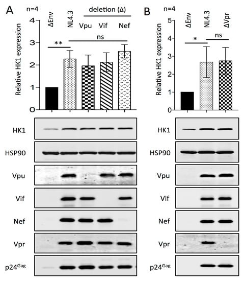 HIV-1 accessory proteins are not required for the upregulation of HK1 in CD4+ T cells infected with HIV-1 NL4.3. (a) Western blotting analysis of CD4+ T cells infected with HIV-1 wt NL4.3 or mutant viruses that have the Env, Vpu, Vif, or Nef genes deleted. Quantified data, that are shown above in a representative Western blot, are relative to HSP90 expression and normalized to the amounts present in cells treated with ΔEnv NL4.3, for four donors; (b) Western blotting analysis of CD4+ T cells infected with HIV-1 wt NL4.3 or mutant viruses that have the Env or Vpr genes deleted. Quantified data, that are shown above in a representative Western blot, are relative to HSP90 expression and normalized to the amounts present in cells treated with ΔEnv NL4.3, for four donors. Significance is indicated by * p ≤ 0.05 and ** p ≤ 0.01.