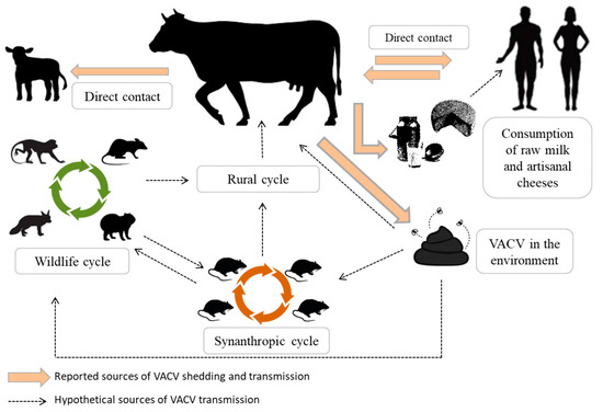 VACV shedding through feces has been demonstrated in cows experimentally infected with the VACV-GP2 strain [47,49]. Moreover, viable VACV has been detected in the feces of cattle with and without BV clinical signs [59]. The horizontal transmission of VACV through feces was evaluated by exposing sentinel mice to wood shavings contaminated with bovine feces [62]. VACV DNA was detected in the feces of the sentinel mice, demonstrating the infectivity of the virus particles eliminated in bovine feces and a potential source of viral circulation among cattle and rodents [62]. The presence of VACV viable particles in the feces in the environment is a potential continuous source of infection. It has been shown that VACV particles could remain viable in protein-rich media for up to 8 months [72]. Furthermore, the persistence of VACV infectious particles in the feces from infected mice has been demonstrated for up to 20 days post-exposure [61]. Fecal shedding could be important for viral maintenance in the environment and a source of viral transmission among species, including humans (Figure 2).