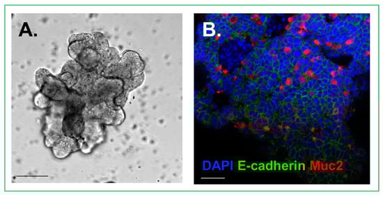 Cultured enteroid. (A) Photomicrograph demonstrating the architecture of an enteroid; (B) Confocal image of an enteroid stained for DAPI (Blue), E-cadherin, an epithelial cell marker (Green), and Muc2, a goblet cell marker (Red). Size bars = 50 μm.