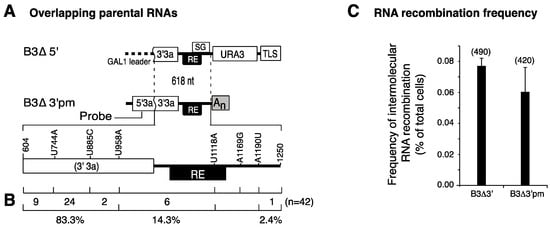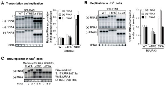 In the absence of selection and continued RNA3 cDNA plasmid transcription, B3URA3 + TRE accumulated to similar levels as B3URA3 (Figure 4A). After repressing plasmid transcription and under uracil selection, B3URA3 + TRE accumulated to 50% to 75% of B3URA3 (Figure 4B). However, B3URA3∆′3a accumulated to higher levels than both B3URA3 and B3URA3 + TRE in the absence of selection (Figure 4A) and in Ura+ colonies (Figure 4B). To determine the frequency of intramolecular RNA recombination in B3URA3 + TRE, 110 Ura+ colonies from three biological replicates were individually grown in 8-mL liquid cultures under uracil selection and total RNA was extracted and analyzed by northern blotting. Fifty-five percent of the Ura+ colonies maintained the initial B3URA3 + TRE replicon, 14 % harbored both B3URA3 + TRE and B3URA3∆′3a, and 31% lost B3URA3 + TRE and harbored only B3URA3∆′3a (Figure 4C). Accordingly, the frequency of intramolecular RNA recombination in B3URA3 + TRE was ~45% during the ~32 yeast generations needed to complete the experiment. Replacement of B3URA3 + TRE by B3URA3∆′3a could be explained by the higher replication of B3URA3∆′3a than B3URA3 + TRE (Figure 4A,B).