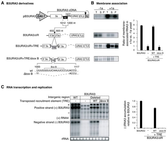 Results described above (Figure 1C) and before [] suggest that in the process of RNA recombination the role of the recruitment element is to mediate 1a-dependent recruitment of individual genomic RNAs into the replication compartments. This model predicts that RNAs, such as parental B3∆3′ derivatives lacking the intergenic region, would participate in intermolecular RNA recombination if recruited into RNA replication compartments by an alternate route. We developed a strategy for recruiting RNA3 derivatives to RNA replication compartments independently of the natural recruitment element. The RNA3 recruitment element was inserted at a transposed location in the middle of the 3a ORF in B3URA3 (Figure 2A) and in parental B3∆3′ derivatives (Figure 3A,B). The transposed recruitment element (TRE) consists of BMV RNA3 nt 1012–1200 [] and lacks the subgenomic promoter []. Template recruitment (Figure 2B) and RNA replication (Figure 2C) were reduced to background levels after removing the intergenic region from B3URA3 (B3URA3∆IR). However, addition of the transposed recruitment element (B3URA3∆IR + TRE), but not of a box B-deficient transposed recruitment element (B3URA3∆IR + TRE∆box B), restored template recruitment (Figure 2B) and RNA replication (Figure 2C). Accordingly, the recruitment element is functional in the middle of the 3a ORF and was added to parental RNA B3∆3′ derivatives (Figure 3A,B) to provide an alternate mode of 1a-mediated recruitment into the RNA replication compartments.