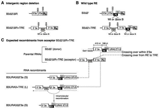 Two distinct RNA products could be formed through recombination between donor B3∆5′ and acceptor B3∆3′∆IR + TRE based on the structure of the parental RNAs and the location of possible homologous crossover sites (Figure 3C). A longer product, B3URA3 + TRE, could be formed by crossing over within 3a sequences, while a shorter product, B3URA3∆3′3a, could be formed by crossing over from the intergenic recruitment element on B3∆5′ to the transposed recruitment element on B3∆3′∆IR + TRE (Figure 3C). B3URA3∆3′3a could also originate by intramolecular recombination between the natural and the transposed recruitment element after formation of B3URA3 + TRE (Figure 3C and Figure 4C). Crossovers exclusively between the natural and transposed recruitment elements of donor and acceptor would only form the shorter B3URA3∆3′3a replicon, and not the longer B3URA3 + TRE replicon (Figure 3C). Crossing over exclusively within 3′3a sequences common to donor and acceptor would form the longer B3URA3 + TRE product, which may be followed by formation of the shorter B3URA3∆3′3a product by intramolecular recombination (Figure 3C).