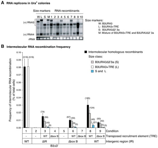 Recombination between donor B3∆5′ and acceptor B3∆3′ derivatives lacking the intergenic region and harboring a transposed recruitment element is predicted to form two groups of structurally different replicons (Figure 3C and Figure 4A). Crossover events within the common 3′3a regions of B3∆5′ and B3∆3′ derivatives lead to the formation of a long recombinant replicon, termed B3URA3 + TRE (Figure 3C). However, crossover events between the recruitment element of B3∆5′ and the transposed recruitment element of B3∆3′ derivatives lead to the formation of short recombinant replicon, termed B3URA3∆3′3a (Figure 3C,D). Additionally, B3URA3∆3′3a could be formed from B3URA3 + TRE by intramolecular RNA recombination within natural and transposed recruitment element sequences (Figure 3C). Thus, we measured the frequency of intramolecular RNA recombination in B3URA3 + TRE and determined its genetic stability. We also compared the replication of B3URA3 + TRE to B3URA3∆3′3a. Replication of B3URA3 + TRE and B3URA3∆3′3a was initiated by plasmid launching and Ura+ colonies were selected []. B3URA3 was included in parallel for comparison.