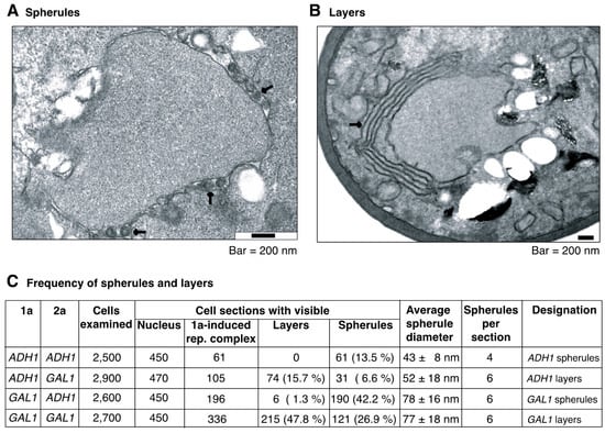 Likewise, two conditions resulted predominantly in layer formation (Figure 6B,C): ADH1-driven 1a with GAL1-driven 2apol (ADH1 layers), and GAL1-driven 1a with GAL1-driven 2apol (GAL1 layers). These results are in agreement with previous studies that characterized layer formation upon expression of both 1a and 2apol from the GAL1 promoter []. Although the number of double-membrane layers did not vary significantly, layers were present in ~3-fold more cells when 1a was expressed from the GAL1 promoter (Figure 6C). These results are consistent with higher accumulation of 1a (Figure 7C), the 1a-dependent formation of replication structures, and the 2apol-dependent modulation of the shape of the replication structures [,]. In three of the four conditions tested a mixture of cell sections containing spherules or layers was detected (Figure 6C). However, within the same cell, spherules and layers were never detected together.