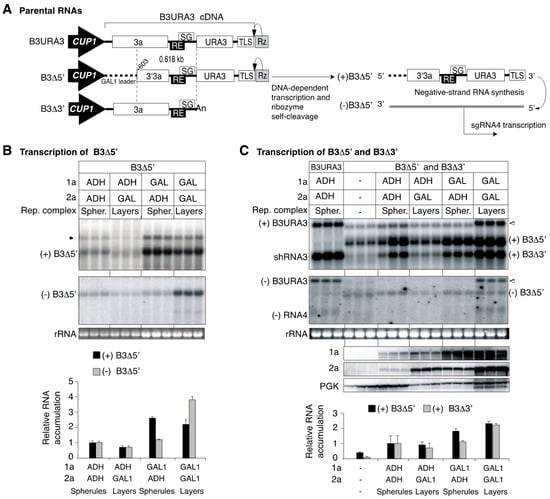 To determine the nature of the RNA supporting Ura+ colony formation (Figure 8A), total RNA from yeast expressing various parental RNA combinations that induced the formation of spherules or layers was extracted from 40 individual colonies and analyzed by northern blotting using a URA3 probe. We failed to detect small sURA3 replicons formed through intramolecular RNA recombination [], and only detected negative-strand B3∆5′ (Figure 8C). Thus, Ura+ colonies detected upon transcription of donor B3∆5′ from the CUP1 promoter were mainly the result of leaky transcriptional activity amplified by synthesis of negative-stand B3∆5′ and subgenomic RNA4 transcription (Figure 7A,B).