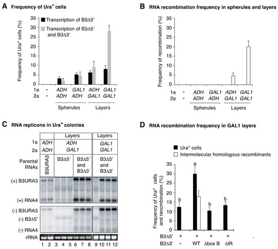 Intermolecular RNA recombination in layers after one yeast generation. Cells were incubated for 15 h in liquid media (8 mL) containing galactose and 500 μM CuSO4. 1a and 2apol were expressed from the ADH or GAL1 promoters to induce the formation of spherules or layers. Ura+ cells were identified by uracil selection on plates. The average sample size was 700 cells per treatment. (A) Frequency of Ura+ cells after transcription of B3Δ5′ alone or in combination with B3Δ3′. Transcription of B3Δ5′ alone supported Ura+ colony formation by directing RNA4 transcription. A significant (p < 0.01) increment in the number of Ura+ cells was obtained in layer-forming conditions. (B) Frequency of intermolecular RNA recombination in Ura+ cells described in (A). (C) The presence of intermolecular RNA recombinants was confirmed by analyzing 48 Ura+ colonies individually grown for 36 h in cultures (8 mL) lacking uracil and copper. RNA was extracted an analyzed by Northern blotting using URA3 probes. Representative blots are shown. B3URA3 was a size marker (lanes 1 and 2). (+) and (−) indicate RNA of positive or negative polarity, respectively. As illustrated in Figure 7A, B3Δ5′ supported negative-strand B3Δ5′ synthesis and RNA4 transcription (lanes 3, 4, 5 and 9). Lanes 6, 7, 8, 10, 11 and 12 are intermolecular RNA recombinants. (D) Frequency of Ura+ cells obtained after transient transcription of B3Δ5′ and wild type or mutant (box B or intergenic region deletion) B3Δ3′ for one yeast generation in GAL1 layers. Induction of transcription, selection, and identification on intermolecular RNA recombinants was as in (A,B). Bars represent the average and standard error of three biological replicates. Bars with the same letter are not significantly different (Tukey's test with alpha = 0.01).