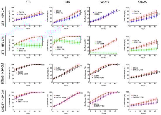 Effect of virus-free HSV1716gfp conditioned media on bystander cell proliferation. Supernatants from HSV1716gfp infected (3–5 MOI) cell lines were harvested and processed to remove virus. Resulting conditioned media (HSV CM) from each cell line (3T3, 3T6, S462TY, SK-N-AS) was added to each respective cell line. Cell proliferation was monitored over a 48-h period. Data are represented as mean ± SD. Statistical significance was determined by two-way ANOVA (Sidak’s Multiple Comparisons Test). * p < 0.05. Abbreviations: NS, not significant; MOI, multiplicity of infection; SD, standard deviation; DMEM, Dulbecco’s modified eagle medium; V CM, HSV1716gfp conditioned media (processed to remove virus).