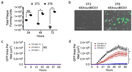 HSV1716gfp virus infection in 3T6 Swiss albino and NIH-3T3 cells. (a) Standard plaque assay was used to determine the amount of virus recovery from 3T3 or 3T6 cells 24, 48, and 72 h after HSV1716 infection (MOI 1); (b) images of 3T6 and 3T3 cells show HSV infection (GFP positive) in 3T6 while no GFP expression is observed in 3T3 cells 48 h-post infection with HSV1716gfp (MOI 1). Scale bar = 200 µm; (c) 3T3 or (d) 3T6 cells were infected at multiple MOIs with HSV1716gfp and monitored for GFP gene transfer by time lapse microscopy. Results are representative of at least 3 independent experiments. Error bars represent standard deviation. Statistical significance was determined by two-way ANOVA (Sidak’s multiple comparisons test). * p < 0.05, ** p < 0.01. Abbreviations: NS, not significant; MOI, multiplicity of infection, GFP, green fluorescent protein.