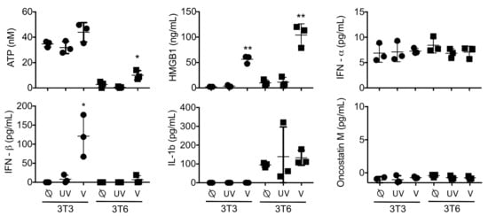 Analysis of supernatants: 3T3 or 3T6 cells with no treatment (⍉) or following infection with 3 MOI UV-Inactivated HSV1716gfp (UV) or 3 MOI HSV1716gfp (V). Levels of Interferon-β were significantly increased in 3T3 cells infected with HSV1716gfp, while both 3T3 and 3T6 cell lines secreted high levels of HMGB1 protein following infection with replication competent virus. UV inactivated HSV1716gfp did not alter cytokine profiles compared to uninfected controls. Results are representative of three independent experiments. Horizontal bars represent means. Statistical significance was determined by one-way ANOVA (Tukey’s Multiple Comparisons Test). α = 0.05; * p < 0.05, ** p < 0.01. Abbreviations: ATP, adenosine triphosphate; HMGB1, high mobility group box 1; IFN, interferon’ MOI, multiplicity of infection.