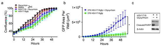 A small molecule HMGB1 inhibitor (Glycyrrhizin; 75 µM) increases HSV1716gfp spread and reduces HSV1716gfp-mediated cell death. (a) 3T6 cells were treated with or without glycyrrhizin (75 µM) in the presence or absence of 0.5 MOI HSV1716gfp and proliferation was monitored until reaching confluence by time lapse microscopy. Asterisks represent statistical significance between 3T6 cells treated with HSV1716gfp + glycyrrhizin versus HSV1716gfp alone; (b) 3T6 cell infected with 0.5 MOI HSV1716gfp were treated with glycyrrhizin (75 µM) or DMSO control and monitored for GFP expression. Areas of GFP positivity significantly increased when cells were treated with glycyrrhizin; (c) Western blot of PARP cleavage revealed virus-mediated cell death was reduced by glycyrrhizin 48 h following infection with 3 MOI HSV1716gfp. +, indicates with; −, indicates without. Results are representative of three independent experiments. Statistical significance was determined by two-way ANOVA (Sidak’s Multiple Comparisons Test). (* p < 0.05). Abbreviations: MOI, multiplicity of infection; NS, not significant; PARP, poly ADP ribose polymerase.