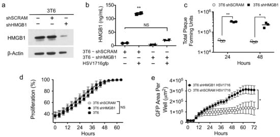 Genetic depletion of HMGB1 increases incidence and recovery of HSV1716gfp infection in 3T6 cells. (a) Western blot for HMGB1 in total cell lysates from parental 3T6 cells, 3T6 shSCRAM, or 3T6 shHMGB1 cells. (b) HMGB1 ELISA of cell supernatants from 3T6 shSCRAM or 3T6 shHMGB1 cells infected with HSV1716gfp (MOI 3) 24 h after infection. (c) Virus recovery from HSV1716gfp-infected 3T6 shSCRAM or shHMGB1 cells 24 and 48 h after infection (MOI 1). (d) Cell proliferation in HMGB1 knockdown 3T6 cells compared to parental 3T6 cell line or shSCRAM control. (e) Area of GFP-positive cells observed in 3T6 shHMGB1 cells infected with HSV1716gfp compared to HSV1716gfp-infected 3T6 shSCRAM cells. Data are shown as mean ± SD. +, indicates with; −, indicates without. Statistical significance was determined by two-way ANOVA (Sidak’s multiple comparisons test). α = 0.05; * p < 0.05, ** p < 0.01. Abbreviations: MOI, multiplicity of infection; SD, standard deviation.