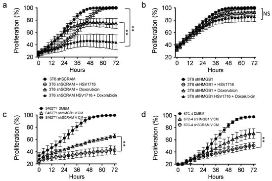 The ability of oncolytic viruses to synergize with cytotoxic drugs has been well documented [,,,]. To determine if HMGB1 influences cell sensitivity to cytotoxic therapies, we treated 3T6 Swiss albino cells with or without HMGB1 knockdown (shHMGB1 or shSCRAM) with HSV1716gfp (MOI 2) in the presence or absence of the antineoplastic agent doxorubicin (50 nM). We observed an additive antiproliferative effect in shScramble 3T6 cell lines treated with HSV1716gfp and/or doxorubicin (Figure 6a). Strikingly, in 3T6 shHMGB1 cells, we did not observe an antiproliferative effect of HSV1716gfp, doxorubicin, or combination HSV1716gfp–doxorubicin (Figure 6b). To test whether or not the virus-free conditioned media from HSV1716gfp-infected 3T6 shScramble or HSV1716gfp-infected 3T6 shHMGB1 cell lines could impact cell proliferation of naïve tumor cells, we added processed HSV1716gfp conditioned media (V CM) to S462TY human MPNST cells (Figure 6c) and 67C-4 murine MPNST cells (Figure 6d). V CM from both shHMGB1 or shScramble cell lines inhibited cell proliferation compared to DMEM (10% FBS). However, partial recovery of proliferation was observed in shHMGB1 HSV171gfp conditioned media (shHMGB1 V CM) compared to shScramble HSV1716gfp conditioned media (shSCRAM V CM) (Figure 6c,d).