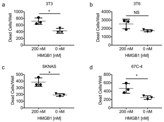 Exogenous recombinant HMGB1 is cytotoxic. (a) NIH-3T3 fibroblasts; (b) 3T6 Swiss albino fibroblasts; (c) SK-N-AS human neuroblastoma; and (d) 67C-4 murine MPNST cell lines were treated with or without recombinant human HMGB1 (rhHMGB1) protein (200 nM) for 72 h. Statistical significance was determined by unpaired two-tailed t test * p < 0.05. Error bars represent standard deviation of the mean. Abbreviations: HMGB1, high mobility group box 1; NS, not significant.