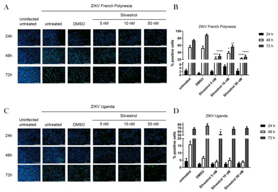 To investigate the potential antiviral effect of silvestrol on ZIKV life cycle, A549 cells were infected with two ZIKV strains with an MOI of 0.1 and subsequently treated with silvestrol for 24, 48, and 72 h. The ZIKV strain 976 Uganda (ZIKV U), which did not show neuropathological effects in patients, was compared to the ZIKV strain PF13/251013-18 (ZIKV FP) from French Polynesia, which was the first strain associated with microcephaly. Based on the data from the cytotoxicity and viability assays and in accordance to a previous study, silvestrol was used in concentrations of 5, 10, and 50 nM [20]. The impact on viral life cycle was analyzed by immunofluorescence microscopy using an NS1-specific antiserum (Figure 2A,C). The quantification of the immunofluorescence microscopy reveals for the ZIKV strain French Polynesia a decrease in the number of ZIKV-positive cells and fluorescence intensity as evidenced by the NS1-specific staining after treatment with silvestrol for 48 h and 72 h (Figure 2B). No significant effect could be observed for the ZIKV Uganda strain, except for 5 nM silvestrol at 48 h (Figure 2D).