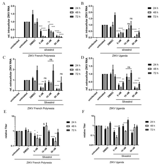 Significant reduction of intra- and extracellular ZIKV RNA levels and released virions. (A) Quantification of intracellular ZIKV RNA of A549 cells infected with ZIKV FP and treated with the indicated concentrations of silvestrol. ZIKV RNA was quantified by RT-qPCR and normalized to the amount of RPL27 transcripts; (B) Quantification of intracellular ZIKV RNA of A549 cells infected with ZIKV U and treated with the indicated concentrations of silvestrol. ZIKV RNA was quantified by RT-qPCR and normalized to the amount of RPL27 transcripts; (C) RT-qPCR quantification of extracellular ZIKV RNA of A549 cells infected with ZIKV FP and treated with the indicated concentrations of silvestrol; (D) RT-qPCR quantification of extracellular ZIKV RNA of A549 cells infected with ZIKV U and treated with the indicated concentrations of silvestrol; (E) Relative extracellular titers of A549 cells infected with ZIKV FP and treated with the indicated concentrations of silvestrol. Titers were quantified by plaque assay in Vero cells; (F) Relative extracellular titers of A549 cells infected with ZIKV U and treated with the indicated concentrations of silvestrol. Titers were quantified by plaque assay in Vero cells. $: only two experiments were performed. ns = not significant = p > 0.05; * = p ≤ 0.05; ** = p ≤ 0.01; *** = p ≤ 0.001; **** = p ≤ 0.0001.