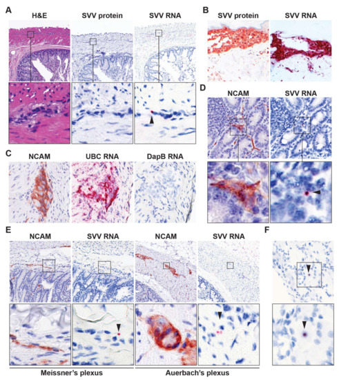 Detection of viral RNA in enteric neurons of latently simian varicella virus (SVV)-infected rhesus macaques. (A) Consecutive intestine sections from latently SVV-infected rhesus macaques (RM) were stained with hematoxylin and eosin (H&E), immunohistochemically (IHC) stained for SVV nucleocapsid protein or stained for SVV ORF63 RNA by in situ hybridization (ISH). Note punctate red ISH staining (arrow head), indicative of low level ORF63 expression. Magnification: 100×; inset: 1000×; (B) Validation of SVV-specific IHC and ISH staining in varicella skin biopsies from SVV-infected African green monkeys [AGMs 273 (IHC) and 269 (ISH)]. Magnification: 200×; (C) Consecutive intestine sections from latently SVV-infected RM were assayed for NCAM expression by IHC, and RNA expression of ubiquitin C (human cellular UBC gene; positive control) and DapB (bacterial gene, negative control) by ISH. Representative images are shown for RM 9021. Magnification: 400×; (D,E) Consecutive RM intestine sections were stained for NCAM by IHC and SVV ORF63 RNA by ISH. Three SVV DNA qPCRP°S intestine paraffin blocks (each containing three distinct biopsies) from two RM (Table 2) were analyzed; (F) Representative images of a SVV ORF63 ISHP°S neuron in latently SVV-infected lumbar dorsal root ganglia of RM 2207; (D,F), magnification: 400×; (E) magnification: 200×. Inset shows enlargement of area indicated by the black box. Arrowheads indicate SVV ISHP°S neurons. Representative images of SVV ISHP°S enteric ganglia (on average 4.3 ISHP°S ganglia per section) are shown for RM 2207 (A,E); and SVV ISHP°S nerve fibers (on average 14.3 ISHP°S nerve fibers per section) are shown for RM 9021 (D).