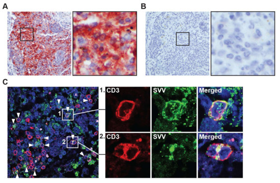 Detection of SVV in intestine-draining mesenteric lymph nodes during acute SVV infection of African green monkeys. (A,B) Consecutive sections of mesenteric lymph nodes, obtained from SVV-infected African green monkeys (AGM) at 9 dpi (acute infection), were stained for by IHC using rabbit anti-SVV nucleocapsid (SVV-NP) (A) and normal rabbit control serum (B); Magnification: 200×; inset: 1000×; (C) Sections of mesenteric lymph nodes obtained from SVV-infected AGM at 9 dpi were assayed by immunofluorescence for expression of CD3 (red) and SVV-NP (green), and nuclei were counterstained with Hoechst 33342 (blue). Arrowheads indicate examples of SVV-infected T-cells. Magnification: 400×. Inset shows enlargement of area indicated by the white boxes. Representative images shown for AGM 269.