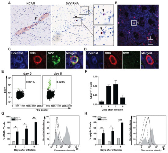 Expression of CD69 and α4β7 integrin on SVV-infected T-cells during acute infection of African green monkeys. (A) Consecutive intestine sections from SVV-infected African green monkeys (AGM) at 9 days post infection (dpi) were stained for NCAM by IHC and SVV ORF63 by ISH. SVV-infected cells localized in close vicinity to enteric neurons in the absence of viral RNA expression in neurons. Magnification: 200×; Inset: 1000×. Arrowheads indicate same cell in adjacent sections; (B–D) Confocal microscopy image showing co-localization of SVV antigen (green) and CD3 (red) in intestine sections from SVV-infected AGM at 9 dpi. Nuclei were counterstained using Hoechst 33342 (blue). Magnification: 400×; (C,D) Show enlargements of white boxes indicated with #1 (example of SVV-infected T-cell) and #2 (uninfected T-cell). Two intestine paraffin blocks (each containing four distinct biopsies) from two AGM were analyzed. Number of ORF63 ISHP°S lymphocyte-like cells and SVV-infected T-cells ranged in numbers from scarce (AGM 294) to abundant (AGM 269). Representative images are shown for AGM 294 (A) and AGM 269 (B–D) [10]; (E,F) Peripheral blood mononuclear cells (PBMC) from a SVV.EGFP-infected AGM were analyzed for the presence of SVV-infected (EGFP+) CD3+ T-cells by flow cytometry; (E) Dot plots showing EGFP+ events (green) among 100,000 T-cells at 0 and 5 dpi for AGM 294; (F) Frequency of EGFP+ T-cells in three SVV.EGFP-infected AGM at 0, 5, 7 and 9 dpi; (G,H) CD69 (G) and α4β7 integrin (H) expression on SVV.EGFP-infected (EGFP+) and uninfected (EGFP−) CD3+ T-cells from three SVV.EGFP-infected AGM at 0, 5, 7 and 9 dpi. Histograms show the expression or CD69 (G) and α4β7 integrin (H) on uninfected (EGFP−, solid black line) or SVV-infected (EGFP+) PBMC (grey filled) of AGM 273 at 5 dpi [10]. Dashed black line indicates fluorescence minus one (FMO) control; (F–H) Data represent average ± SEM from 3 AGM. ns: not significant; * p <0.05, *** p < 0.001 by unpaired Student’s t-test.