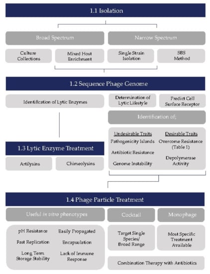 Phage therapy has the potential to alleviate the ever-growing problem of antibiotic-resistance and the development of so-called “superbugs”, either as an alternative to antibiotics, or in combination with traditional antibiotic therapies to enhance their effectiveness. Despite the regulatory concerns associated with phages as therapeutic agents, phage biologists have continued in the search for phages with therapeutic potential, resulting in the isolation of countless phages that could represent an endless arsenal against a range of human and animal pathogens. Furthermore, the development of phage products such as chimeric lysins and artilysins, highlights the reservoir of antimicrobial agents that may be harnessed from phages without the need for direct application of intact phages. However, we must endeavor to overcome regulatory concerns regarding the application of intact phages, since phages are ubiquitous and are innate residents of humans. While numerous studies have been performed regarding the isolation of novel phages and their characterization, a more unified approach to the assessment of phages may be required to ensure the ultimate success of phage therapy into the future. Here, through a review of desirable phage phenotypes that phage biologists may seek out when isolating phages, we propose a workflow for selection of candidates for therapeutic purposes (Figure 1). Firstly, in isolation of phages attempts should be made to target isolation towards broad or narrow host range phages (as desired) through implementation of various isolation methods (Figure 1(1.1)). The next step in the workflow should be genome sequencing (Figure 1(1.2)) representing one of the most important steps in candidate selection for several of reasons. Firstly, it will enable identification of putative phage-encoded lytic proteins for lytic enzyme therapy (Figure 1(1.3)), and secondly it will allow assessment of the genomic characteristics (both favorable and unfavorable) of candidates for implementation in phage particle therapy. Here, we can ensure the lytic nature of candidates through identification of proteins (in particular integrase/resolvase and repressor proteins) likely to be involved in the lysogenic lifestyle preventing inefficient lysis due to lysogenic conversion. Additionally, identification of receptor binding proteins, leading to the prediction of cell surface receptors, should guide informed selection of phages for generation of a phage cocktail targeting different cell surface moieties. Genome sequencing has other added advantages in the identification of other desirable such as depolymerase activity or the ability to overcome phage resistance as well as undesirable traits such as antibiotic resistance genes, pathogenicity islands, and genome instability. Sequencing at an early stage in candidate selection is advisable, as identification of these traits would render a phage unsuitable for use in therapy, thus rendering all other characterizations redundant. Following confirmation of suitability for phage therapy (Figure 1(1.4)), phages should be assessed for suitable in vitro characteristics as discussed above before selection for use in a therapeutic setting (perhaps first by means of an animal model prior to a human clinical trial). As we face the current antibiotic crisis, this workflow should prove to be useful in the isolation and identification of phage therapy candidates, which we hope will become a viable and widespread alternative to antibiotic therapy.