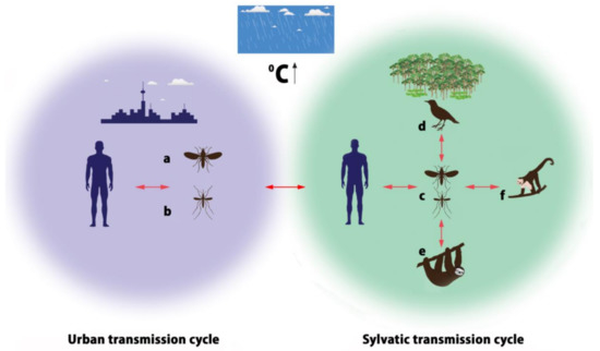 Humans are probably the link between the two distinct transmission cycles, since OROV is usually invading urban areas through a viremic individual who visited a forest, got infected there and returned to an urban area during the viremic phase [5]. Still, there are gaps of knowledge in the transmission cycle, such as the reported low isolation rates (1:12,500) of OROV from midges during epidemics, which may be attributed to low susceptibility of this vector to the virus or to the ability of a fragment only of the insect population to transmit OROV, but this has to be answered by further studies [5,40]. In addition, the role of wild animals has not been explored adequately in other geographic locations outside Brazil, as well as the role of birds in the potential spread of OROV in other countries or continents taking into account the birds’ wide geographic distribution and movement. From the available literature data, OROV is circulating at low levels in the wildlife and human reservoirs, but whenever a perturbation in the environment (vegetation loss/deforestation, habitat loss) and/or in the community (human and/or animal immigration) occurs, OROV outbreaks are emerging. Therefore, the urban transmission of OROV can probably be sporadic and temporary, but also may be maintained among urban populations for longer periods or permanently, at a relatively low level of activity and thus may go unrecognized [29]. A surveillance study in Iquitos, Peru, during a period of significantly increased transmission, suggested a peri-urban transmission cycle, since the majority of OROV isolates were detected in both rural and urban sites located in the outskirts of the city [45].