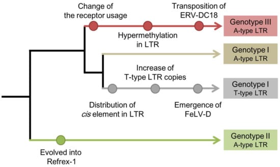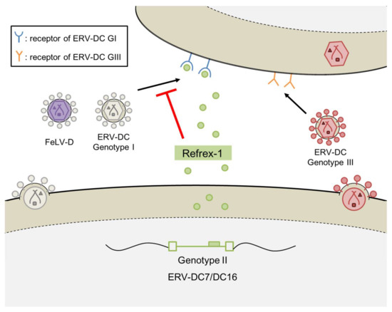 In the last decade, the specific characteristics of each genotype have been clarified (Figure 1). For example, the GI and GIII proviruses can produce replication-competent viruses, and these viruses use different receptors for infection [16,19]. The GI env gene has also been transduced into the feline leukemia virus (FeLV), generating a novel interference subgroup: FeLV subgroup D (FeLV-D) [16]. The GII proviruses encode an antiviral factor, Refrex-1, that specifically inhibits ERV-DC GI and FeLV-D infections [20]. In this review, we summarize ERV-DC-related phenomena and discuss the continuous evolutionary processes of ERV-DC.