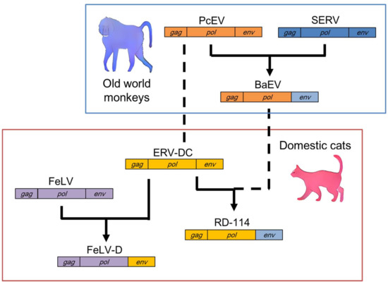 RD-114 was first isolated from fetal kittens that had ingested human rhabdomyosarcoma cells, and subsequent studies showed that RD-114 is a domestic cat ERV [52]. The identification of ERV-DC revealed that RD-114 is a chimeric virus composed of the gag-pol genes of ERV-DC and the env gene of a baboon endogenous retrovirus (BaEV) (Figure 2) [16,18]. Other studies have shown that BaEV is also a chimeric virus composed of the gag-pol genes of a Papio cynocephalus endogenous retrovirus (PcEV) and the env gene of a simian endogenous retrovirus (SERV) [53,54,55]. Therefore, RD-114 was generated by at least two recombination events: the transduction of SERV env into PcEV and the transduction of BaEV env into ERV-DC [56]. Interestingly, PcEV appears to be a counterpart of ERV-DC in the baboon, because these genomes share approximately 70% similarity. These results suggest that multiple interspecies transmissions have occurred among old world monkeys and cats, with several subsequent recombination events among the transmitted viruses.