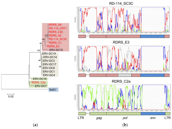 Although the existence of both ERV-DC and RD-114 has not been confirmed in the chromosomal DNA of the Tsushima wild cat (Prionailurus bengalensis euptilurus), it is predicted that a recombination event between ERV-DC and BaEV occurred about 6.2–9.3 million years ago (mya), when the genus Felis and the genus Prionailurus seem to have separated [16,57]. However, it is still unclear how ERV-DC and RD-114 coexisted within the same host. Therefore, we analyzed the details of these recombination events using ERV-DC, RD-114, and RD114-virus-related sequences (RDRSs) [58,59].