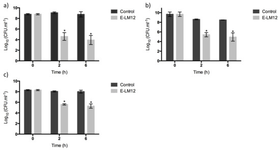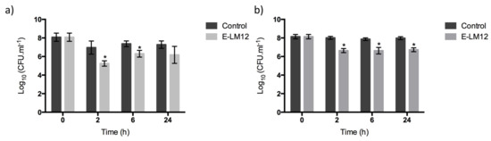 3.6. E-LM12 Has an Anti-Biofilm Effect, Being Able to Lyse Exponential and Stationary Phase Cells