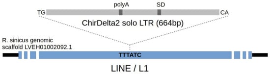 This putative deltaretroviral sequence is localized on a single scaffold (GenBank accession no. LVEH01002092; Figure S1) of the R. sinicus genome assembly (GenBank accession no. LVEH00000000). Sequence comparison with the MINERVa provirus showed that it represents a single viral long terminal repeat (LTR) sequence flanked by target-site duplications (TSD) that are six base pairs (bp) in length—this being consistent with other deltaretroviruses []. Repeatmasker analysis [] revealed that the surrounding part of the scaffold is represented by a LINE/L1 element, into which the proviral sequence has been integrated (Figure 1). Moreover, almost the entire 7134 bp-long scaffold is comprised of L1 fragments, which precludes further description of the insertion locus in a chromosomal context. Based on the close homology to the MINERVa Deltaretrovirus, we named the virus this sequence is derived from ‘chiropteran Deltaretrovirus 2′ (ChirDelta2), while the locus itself is refered to as ERV-ChirDelta2.1. When referring to the insertion in a particular species, we append the species name (or an abbreviation of it): e.g., ERV-ChirDelta2.1-R. sinicus.