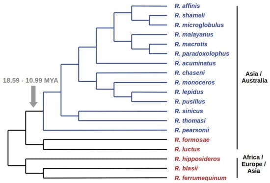 - Stoffberg, S.; Jacobs, D.S.; Mackie, I.J.; Matthee, C.A. Molecular phylogenetics and historical biogeography of Rhinolophus bats. Mol. Phylogenet. Evol. 2010, 54, 1–9. [Google Scholar] [CrossRef] [PubMed]