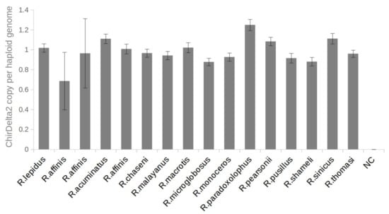 Number of ChirDelta2 copies in genomes of rhinolophid species. The chart shows copy numbers of ChirDelta2 sequence. These were determined by ddPCR absolute quantification using a set of primers specific to the internal part of the ChirDelta2 sequence. All values were normalized to the values obtained for reference locus in rhinolophid genome. The error bars represent poisson 95% confidence intervals of ddPCR analysis. NC—nontemplate control.