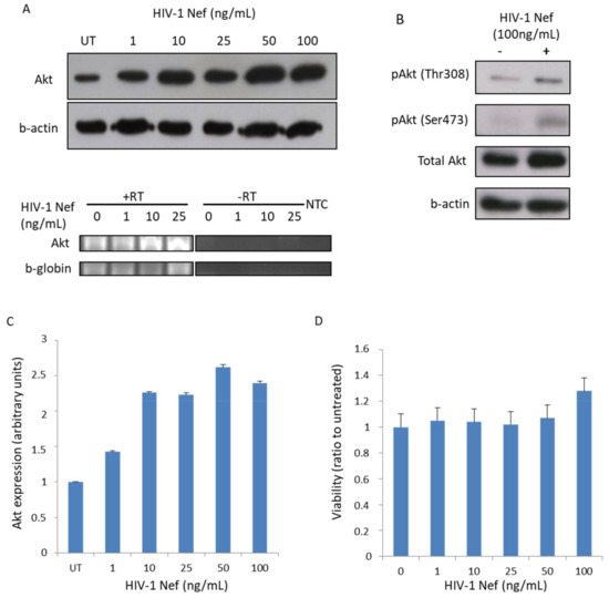 HIV-1 Nef is an accessory viral protein known to be abundantly expressed in the early stages of infection. Several aspects of the viral pathogenesis have been showed to be affected by this multifunctional protein, which plays an important role despite lacking enzymatic activity [6,7]. Besides endogenously produced Nef, extracellular soluble Nef and/or vesicle-associated Nef are found in the serum or extracellular environment of infected individuals and display immunomodulatory effects such as the suppression of immunoglobulin class switching in bystander B cells and neurotoxicity [8,9,10,11]. The PI3K/Akt pathway, a key pathway of cell survival, is known to be manipulated by a plethora of viral pathogens, including among others human cytomegalovirus, Epstein Barr virus, influenza A virus, and HIV-1 [12]. Several studies have also reported the impact of protease inhibitors (PIs) on Akt signaling in several cell types and in clinical trials [13,14,15,16,17,18,19]. We observed previously a critical role for Nef in the hyperactivation of T cells through Akt activation and that blocking Akt activation especially by HIV-1 protease inhibitors (PIs) could limit HIV-1 recovery from latently infected T cells [20,21].