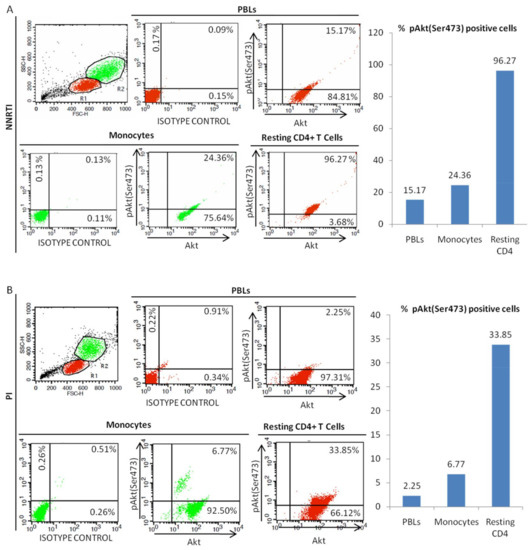 PBLs, monocytes, and resting CD4+ T cells were fixed and permeabilized (BD Cytofix/Cytoperm kit) (BD Biosciences, San Jose, CA, USA). Briefly, 106 cells were thoroughly resuspended in 250 µL of BD Cytofix/Cytoperm solution for 20 min at 4 °C. Cells were washed two times in 1X BD Perm/Wash solution. The cells were pelleted by centrifugation. The cells were thoroughly resuspended in 500 µL of 1X BD Perm/Wash containing PE-conjugated anti-pAkt (cat# 558275)/anti-Akt (cat# 560049) antibodies (BD Biosciences) or isotype control antibody (cat# 551436) (BD Pharmingen). The cells were incubated at 4 °C for 30 min in the dark. The cells were washed three times in 1X BD Perm/Wash solution and resuspended in 1X PBS prior to flow cytometric analysis.