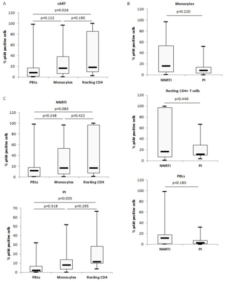 In HIV-1-positive patients under cART, Akt activation was lower in monocytes compared to autologous resting CD4+ T cells with the lowest activation in the bulk of PBLs (Figure 4 and Figure 5A) (Table 1). The lowest Akt activation was observed in aviremic patients under PI-cART rather than under NNRTI-cART, and primarily in monocytes and PBLs rather than in autologous resting CD4+ T cells (Figure 5B) (Table 1). PI-cART was more efficient for decreasing Akt activation than NNRTI-cART irrespective of the cell type tested (Figure 5C) (Table 1). Altogether, our results indicate that PI-cART treatment is the most potent to decrease Akt activation especially in monocytes isolated from aviremic patients.