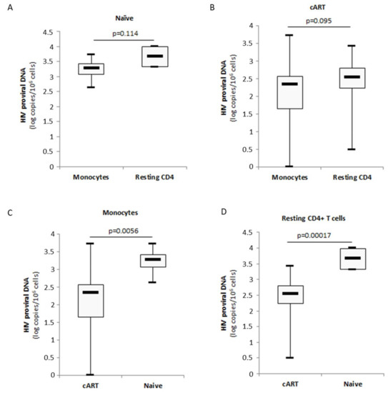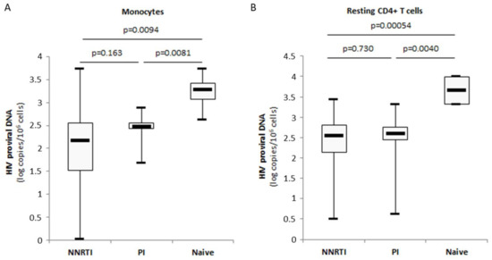Besides resting CD4+ T cells, latently infected monocytes/macrophages that harbour integrated replication-competent viral DNA represent a primary long-lived source of persistent HIV-1 in patients under cART [27,28,29]. Therefore, we decided to analyze the respective sizes of the HIV-1 reservoirs in monocytes and resting CD4+ T cells from patients naïve of treatment and the impact of the cART regimen on the viral reservoir in monocytes and autologous resting CD4+ T cells by quantifying total proviral HIV-1 DNA. The amount of HIV-1 proviral DNA was lower in monocytes compared to autologous resting CD4+ T cells isolated from cART naïve patients (3.2 log versus 3.7 log, p = 0.114) (Figure 6A). A similar lower amount of HIV-1 proviral DNA was measured in monocytes compared to resting CD4+ T cells from cART-treated patients (2.2 log versus 2.4 log, p = 0.095) (Figure 6B). Under cART, the amount of HIV-1 proviral DNA present in monocytes and resting CD4+ T cells was decreased significantly compared to cART-naïve patients (p = 0.0056 and p = 0.00017, respectively) (Figure 6C,D). In PI-treated patients but also in NNRTI-treated patients, significantly lower amounts of proviral DNA were measured in monocytes (p = 0.0081 and p = 0.0094, respectively) and resting CD4+ T cells (p = 0.0040 and p = 0.00054, respectively) compared to cART-naïve patients (Figure 7A,B). We did not find significant difference for the amount of proviral DNA present in monocytes and resting CD4+ T cells between PI-cART- and NNRTI-cART-treated patients (Figure 7A,B) (Table 1).