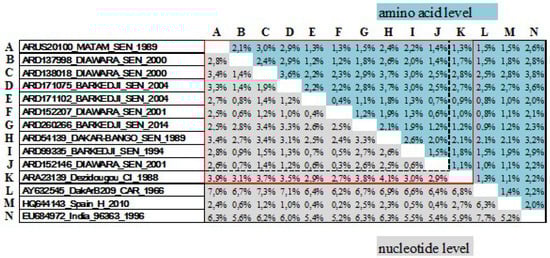 Pairwise genetic distances of coding sequences were evaluated at nucleotide and amino acid levels between isolates characterized in this study and in comparison with previously available BAGV sequences (Figure 1). Nucleotide sequences of BAGV isolated from Senegal showed a mean distance of 1.9% ± 0.8% (0.3–3.4%). This lowest genetic distance was also apparent at amino acid level with a mean distance of 1.9% ± 0.6% (0.4–3.7%).