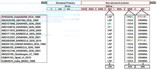 Determination of informative sites on polyprotein sequences of Bagaza virus isolates. Amino acid positions with non-conservative mutations are highlighted in different colors. Location of each motif is identified by corresponding positions on Bagaza virus genome.