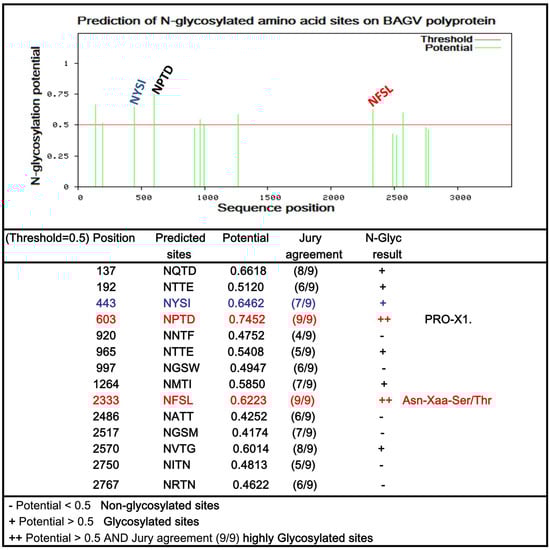 Prediction of N-glycosylated sites on the genome of BAGV were performed by submitting complete polyproteins on online version of NetNGlyc 1.0 Server (http://www.cbs.dtu.dk/services/NetNGlyc/). N-linked glycosylation is a post-translational event whereby carbohydrates are added to Asparagines, which occur in the consensus sequence Asn-Xaa-Ser/Thr, where Xaa is any amino acid except proline. “Potential” scores of predicted N-glycosylated sites across the protein chain from N- to C-terminal were illustrated using the default threshold of 0.5 and the “jury agreement” indicates how many of the nine networks support the prediction [].