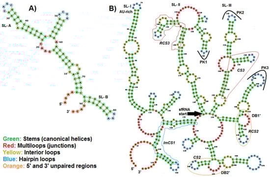 However, the RNAalifold method implemented in the Vienna RNA Websuite server predicted that, as in the genome of other members of the genus flavivirus, BAGV has a shorter 5′ UTR (≈100 nt), consisting of a pair of conserved stem-loops (SL-A and SL-B) (Figure 4). SL-A serves as promoter of viral polymerase activity followed by a shorter loop which contains a cyclisation sequence upstream of the 5′ AUG (SL-B). The secondary structure of BAGV’s 3′ UTR could be divided in three parts; a highly variable domain 1 following the stop codon and consisting in an AU-rich stem-loop (SL-I), a second domain 2 with highly conserved sequence and two stem-loops (SL-II and SL-III) and dumbbell structures (DB1 and DB2), and the moderately conserved distal domain 3 which contains the complementary cyclisation elements. In the intermediate domain, the SL-II presented a pseudoknot PK1 preceding a short conserved loop (RCS3). This structural motif was repeated in a stem-loop SL-III with PK2 and CS3. These stem-loops were followed by dumbbell structures DB1 and DB2 that presented conserved loop RCS2 connected with a pseudoknot PK3 and its repetition CS2, respectively []. Thus, organization of conserved sequences on consensus secondary structure of BAGV’s 3′ UTR was structured RCS3-CS3-RCS2-CS2-ImCS1. Indeed, CS1 was imperfect (ImCS1) only on sequences of West African BAGV isolates with a total of nine substitutions compared to the corresponding consensus sequence previously described [].