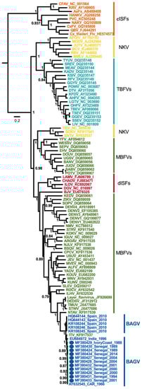 Maximum Likelihood (ML) tree based on complete polyprotein sequences of Bagaza virus isolates circulating in Senegal and Côte d’Ivoire from 1988 to 2014. The tree is midpoint-rooted, nodes are labeled with local support values computed using the Shimodaira-Hasegawa (SH) test for 5000 bootstrap replications, species names are color-coded as follows: new characterized BAGV isolates—dark blue with dots; previous sequences of BAGV—dark blue; mosquito-borne flaviviruses (MBFVs)—green; dual-host affiliated ISFs (dISFs)—red; no Known Vector (NKV) flaviviruses—yellow; tick-born flaviviruses (TBFVs)—light blue; classical ISFs (cISFs)—Orange.