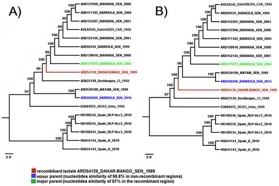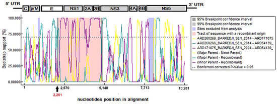 Given the major implications of recombination events for evolution, pathogenicity, or diagnosis of non-segmented positive RNA viruses like flaviviruses [], it is clearly important to determine their occurrence in the BAGV genome. The RDP4beta 4.8 program used for assessment of recombination events on complete polyprotein sequences [] revealed evidence of only one highly credible recombination event from the E protein to NS2B, with estimated breakpoints at positions 2202 and 4908 of BAGV genome. This recombination event involved the isolate ARD54139_Dakar-Bango_SEN_1989 originating from Saint-Louis, in the North of Senegal (Figure 6). Considering the isolates ARD260266_Barkedji_SEN_2014 and ARD171075_Barkedji_SEN_2004 as respective minor and major parents of the isolate ARD54139_Dakar-Bango_SEN_1989 (Similarity of 98.8% and 97%, respectively), this recombination event was found by RDP, GENECONV, Bootscan, Maxchi, Chimaera, SiSscan and 3Seq methods and supported by significant p-values of 3.09 × 10–16, 9.23 × 10−12, 7.36 × 10−13, 8.45 × 10−7, 1.59 × 10−7, 3.60 × 10−8 and 1.17 × 10−12, respectively. The BootScan and GARD analyzes identified one significant recombination breakpoint at nucleotide position 2201 corresponding to the E protein, supported by a LHS p-value of 0.024 and a RHS p-value of 0.001.