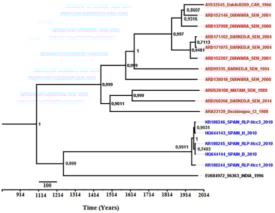 Maximum Clade Credibility (MCC) tree inferred for concatenated sequences from C, E, NS1, NS2A, NS3, NS4B and NS5 proteins of Bagaza virus isolates. Consensus MCC tree on which nodes were supported by posterior’s values and tree has been rooted with estimated times of emergence from the most recent common ancestor (TMRCA). Names of African BAGV isolates are highlighted in red, names of Spanish isolates in blue and name of the Indian isolate in black.