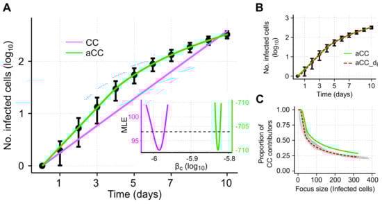 1) in the Materials and Methods for a detailed description of the model). In this model, the two infection processes of CF- and CC-transmission are generally described by mass-action kinetics dependent on the viral concentration,